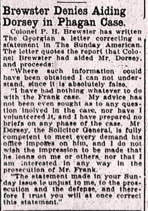 Colonel P. H. Brewster has written The Georgian a letter correcting a statement in The Sunday American. The letter quotes the report that Colonel Brewster had aided Mr. Dorsey, and proceeds: