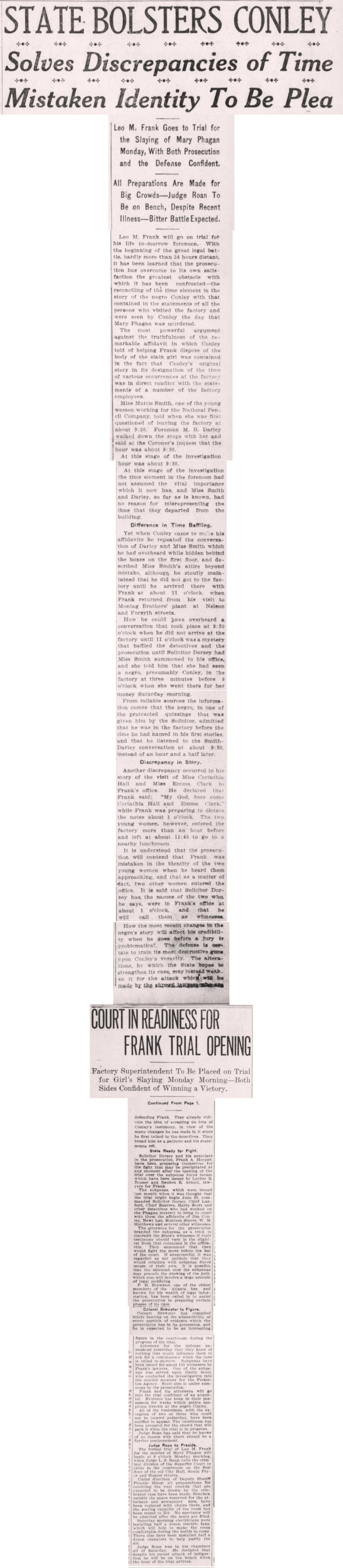 Leo M. Frank will go on trial for his life to-morrow forenoon. With the beginning of the great legal battle, hardly more than 24 hours distant, it has been learned that the prosecution has overcome to its own satisfaction the greatest obstacle with which it has been confronted—the reconciling of the negro Conley with that contained in the statements of all the persons who visited the factory and were seen by Conley the day that Mary Phagan was murdered.