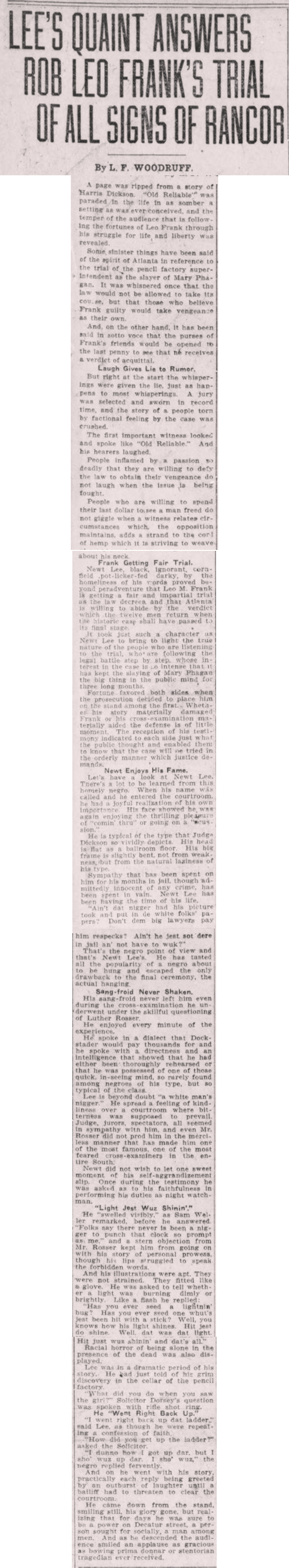 Newt Lee, black, ignorant, cornfield pot-licker-fed darky, by the homeliness of his words proved beyond peradventure that Leo M. Frank is getting a fair and impartial trial as the law decrees, and that Atlanta is willing to abide by the verdict which the twelve men return when the historic case shall have passed to its final stage.