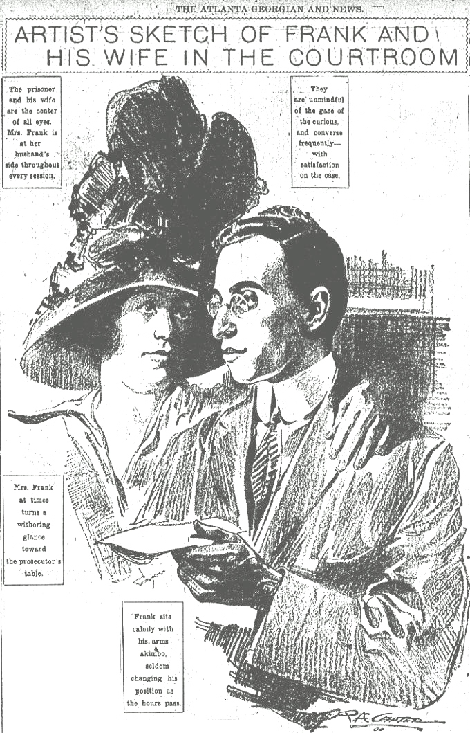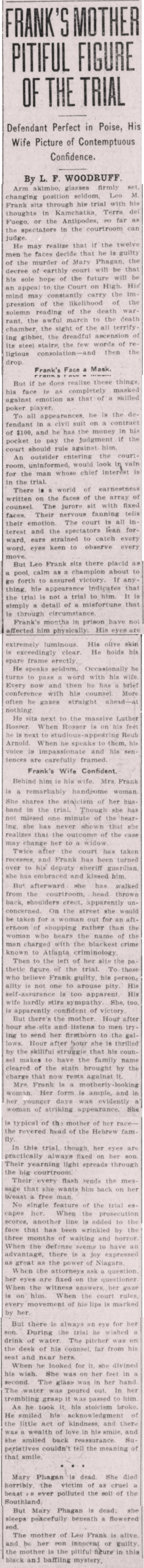 Behind him is his wife. Mrs. Frank is a remarkably handsome woman. She shares the stoicism of her husband in the trial. Though she has not missed one minute of the hearing, she has never shown that she realizes that the outcome of the case may change her to a widow.