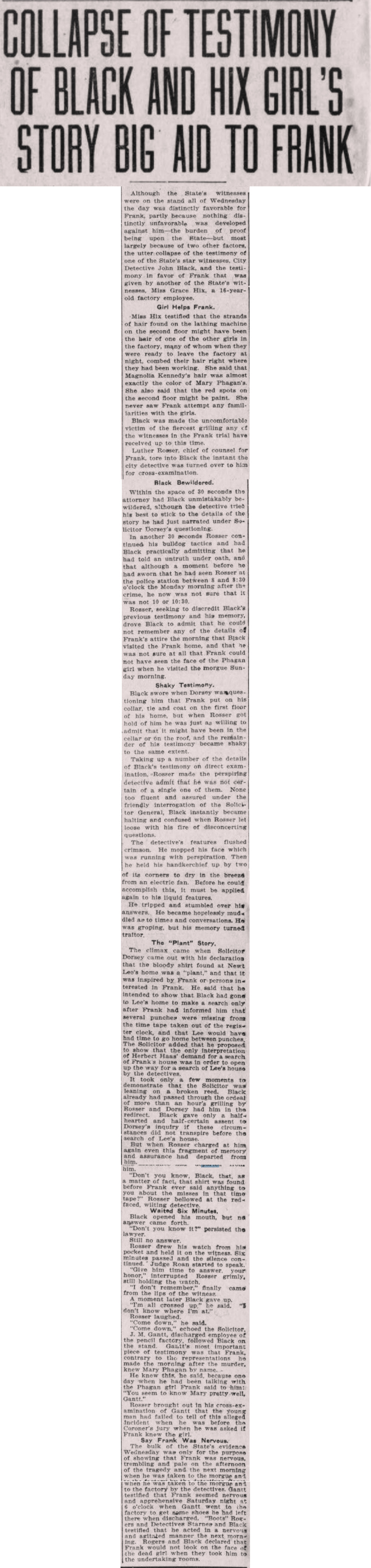 Although the State's witnesses were on the stand all of Wednesday the day was distinctly favorable for Frank, partly because nothing distinctly unfavorable was developed against him—the burden of proof being upon the State—but most largely because of two other factors, the utter collapse of the testimony of one of the State's star witnesses, City Detective John Black, and the testimony in favor of Frank that was given by another of the State's witnesses, Miss Grace Hix, a 16-year-old factory employee.