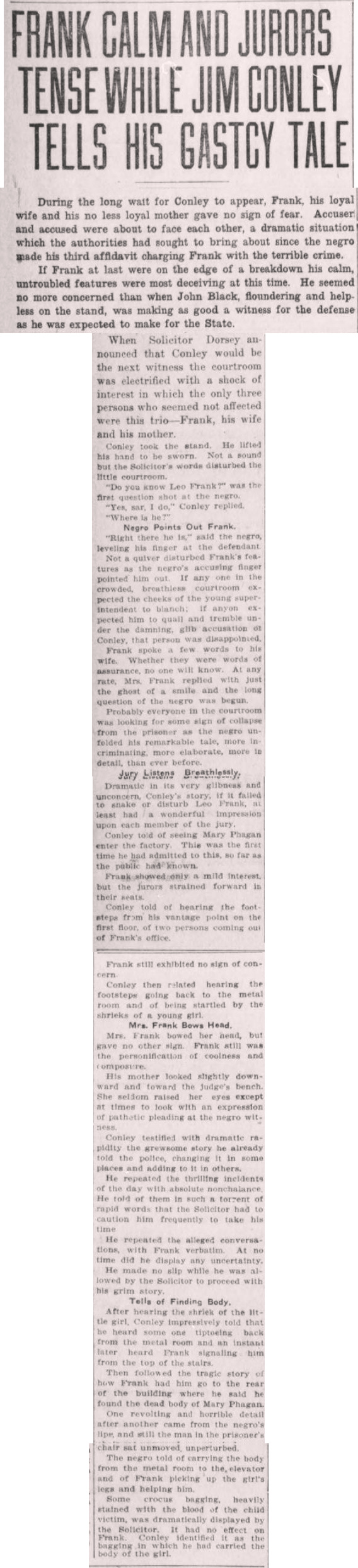 Dramatic in its very glibness and unconcern, Conley's story, if it failed to shake or disturb Leo Frank, at least had a wonderful impression upon each member of the jury.
