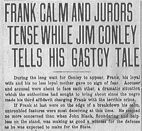During the long wait for Conley to appear, Frank, his loyal wife and his no less loyal mother gave no sign of fear. Accuser and accused were about to face each other, a dramatic situation which the authorities had sought to bring about since the negro made his third affidavit charging Frank with the terrible crime.