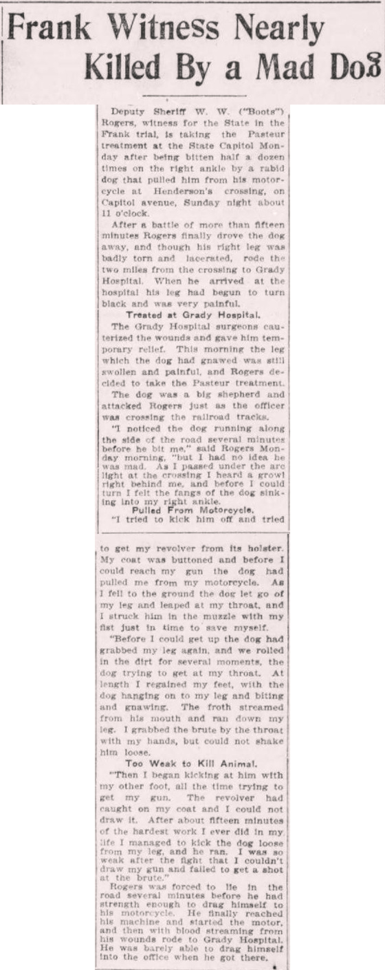 Deputy Sheriff W. W. ("Boots") Rogers, witness for the State in the Frank trial, is taking the Pasteur treatment at the State Capitol Monday after being bitten half a dozen times on the right ankle by a rabid dog that pulled him from his motorcycle at Henderson's crossing, on Capitol avenue, Sunday night about 11 o'clock.
