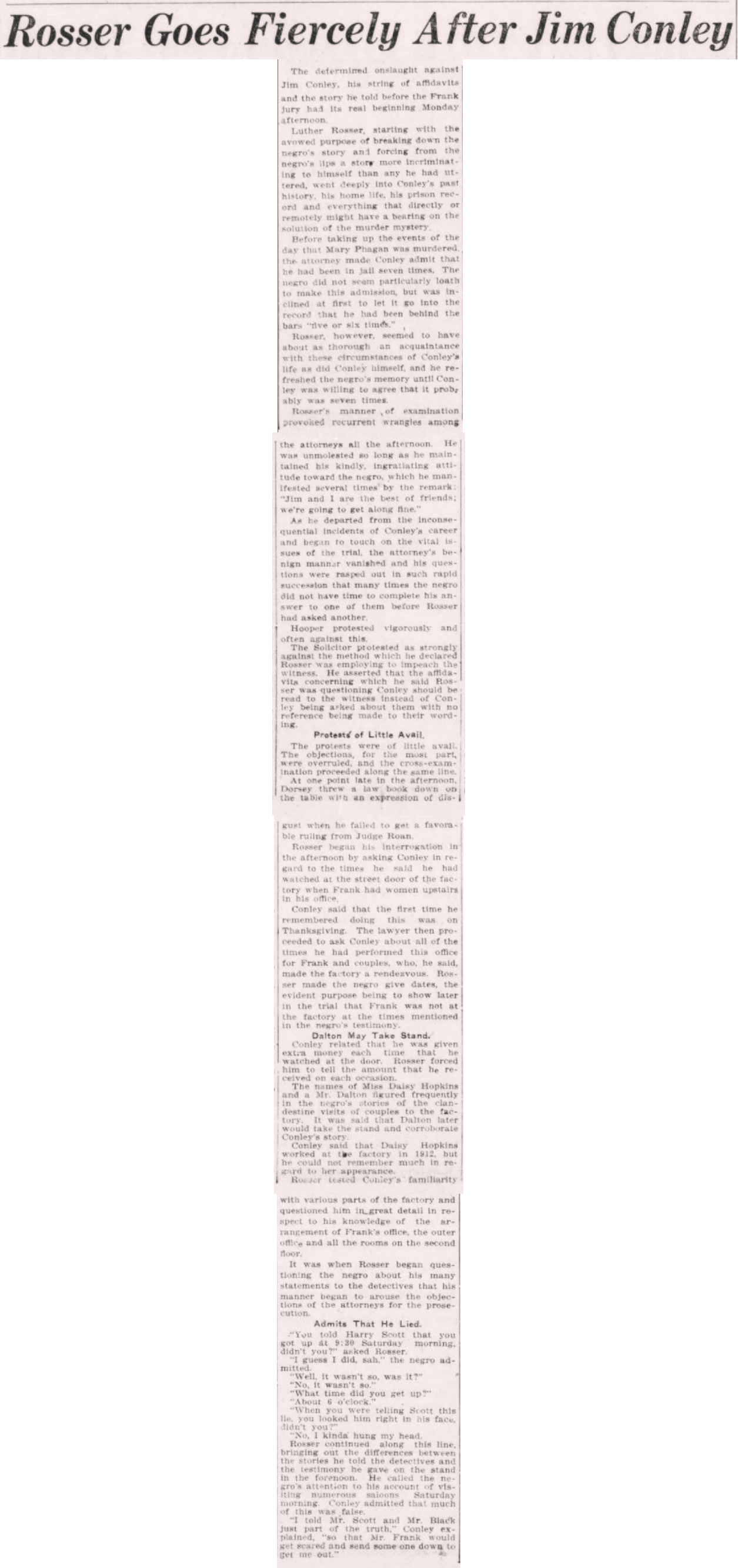 Rosser continued along this line, bringing out the differences between the stories he told the detectives and the testimony he gave on the stand in the forenoon. He called the negro's attention to this accoutn of visiting numerous saloons, Saturday morning. Conley admitted that much of this was false.