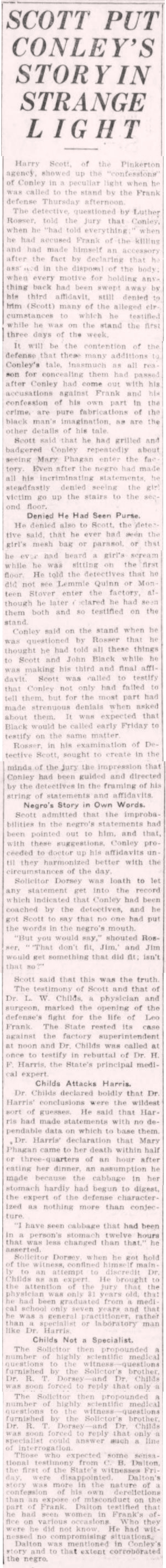 Harry Scott, of the Pinkerton agency, showed up the "confessions" of Conley in a peculiar light when he was called to the stand by the Frank defense Thursday afternoon.
