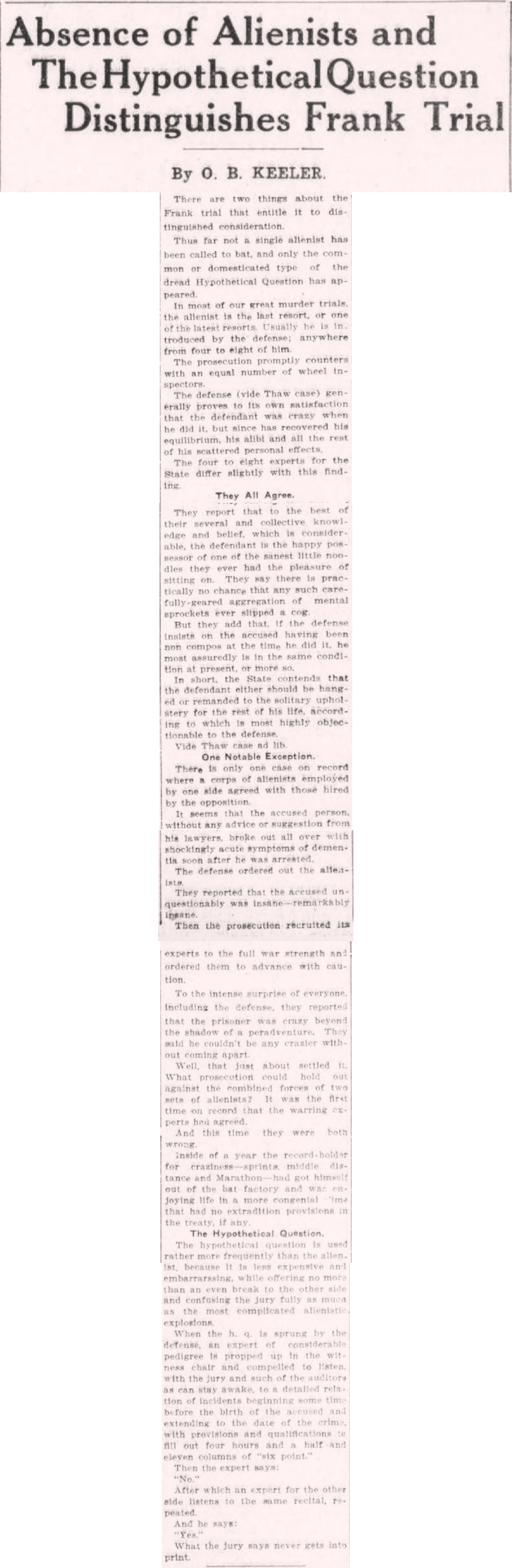 Thus far not a single alienist has been called to bat, and only the common or domesticated type of the dread Hypothetical Question has appeared.
