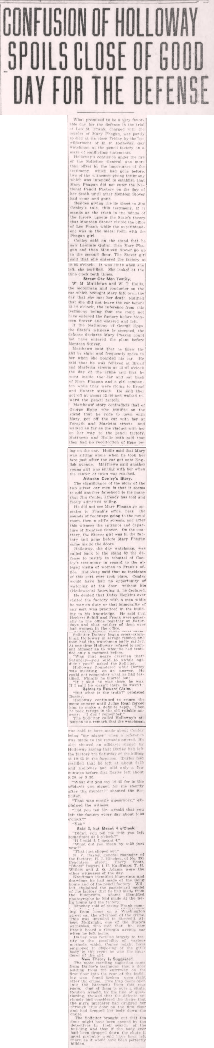 What promised to be a very favorable day for the defense in the trial of Leo M. Frank, charged with the murder of Mary Phagan, was partly spoiled at its close Friday by the bewilderment of E. F. Holloway, day watchman at the pencil factory, in a maze of conflicting statements.