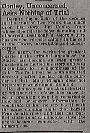 Despite the attacks of the defense in the trial of Leo Frank has made upon his story, Jim Conley—from whose lips fell the most damning and abhorrent testimony a Georgia jury has ever heard—sits calmly in his cell at the Tower, inscrutable and unconcerned.