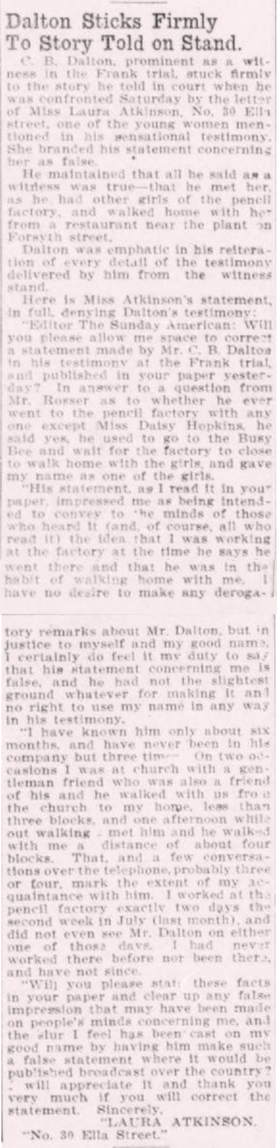 C. B. Dalton, prominent as a witness in the Frank trial, stuck firmly to the story he told in court when he was confronted Saturday by the letter of Miss Laura Atkinson, No. 30 Ella street, one of the young women mentioned in his sensational testimony. She branded his statement concerning her as false.