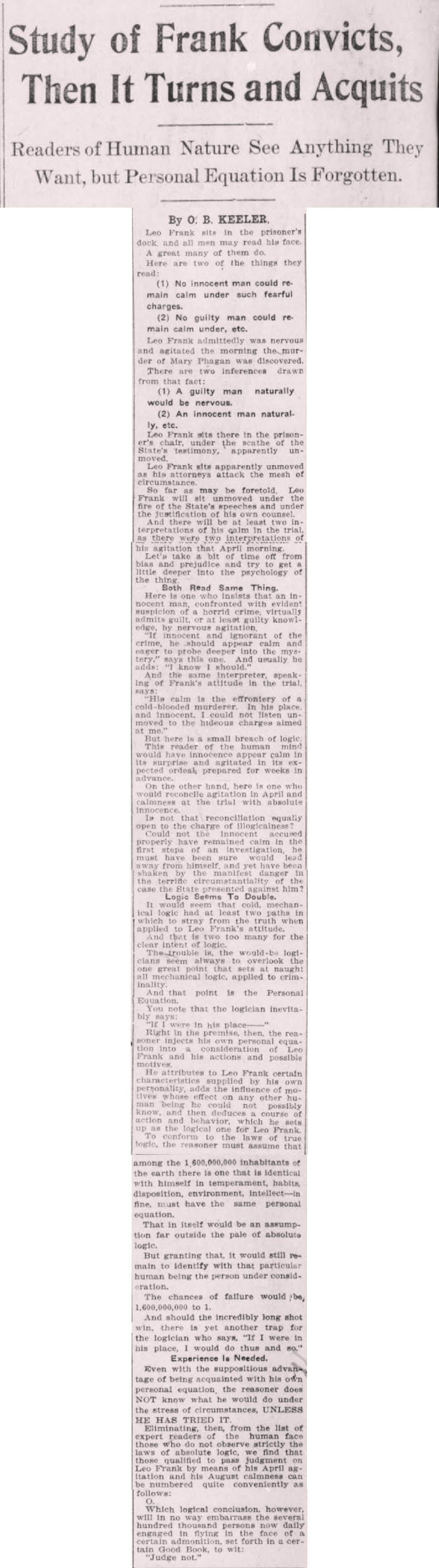 It would seem that cold, mechanical logic had at least two paths in which to stray from the truth when applied to Leo Frank's attitude.