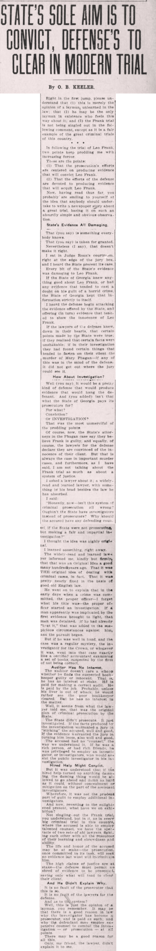 Of course, now, the State's attorneys in the Phagan case say they believe Frank is guilty, and equally, of course, the lawyers for the defense declare they are convinced of the innocence of their client. But that is always the case in important murder cases, and furthermore, as I have said, I am not talking about the Frank trial as much as about a system of justice.