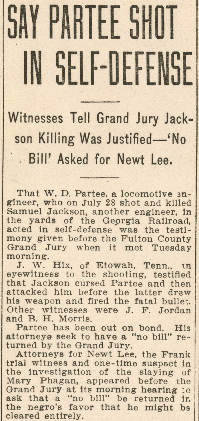 That W. D. Partee, a locomotive engineer, who on July 28 shot and killed Samuel Jackson, another engineer, in the yards of the Georgia Railroad, acted in self-defense was the testimony given before the Fulton County Grand Jury when it met Tuesday morning.