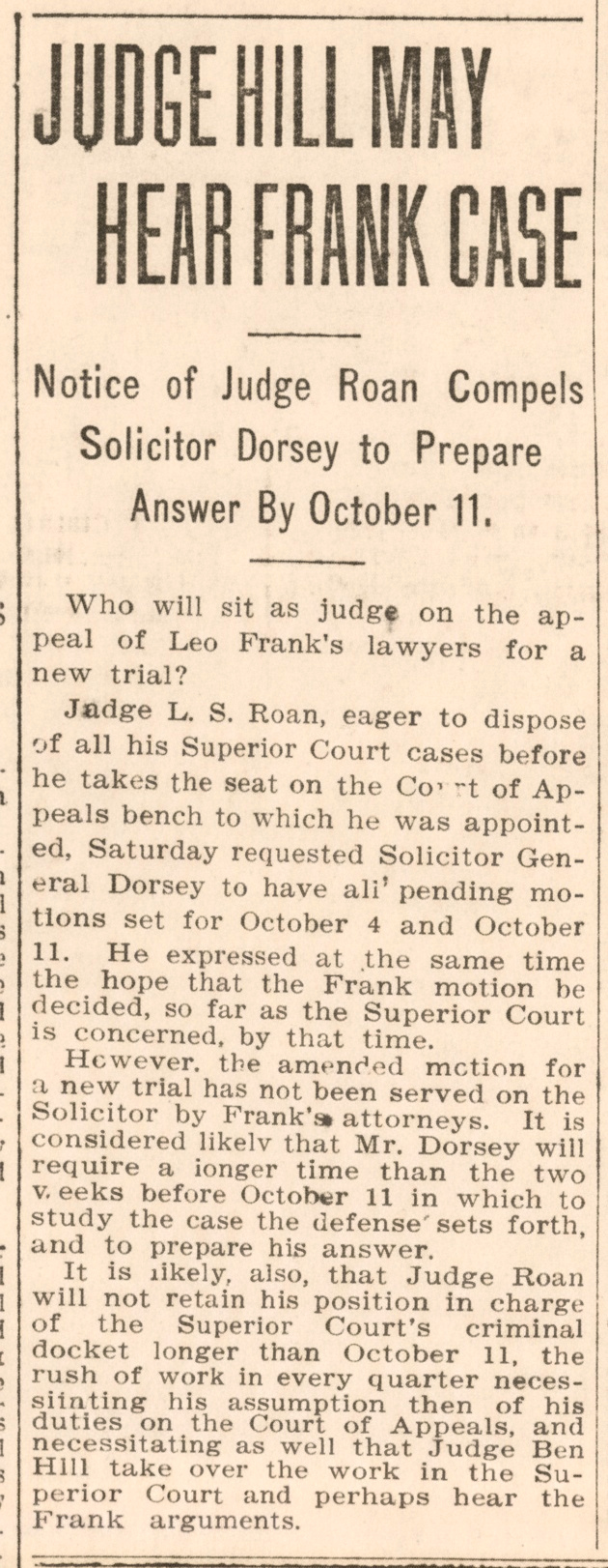 It is likely, also, Judge Roan will not retain his position in charge of the Superior Court's criminal docket longer than October 11, the rush of work in every quarter necessitating his assumption then of his duties on the Court of Appeals, and necessitating as well that Judge Ben Hill take over the work in the Superior Court and perhaps hear the Frank arguments.