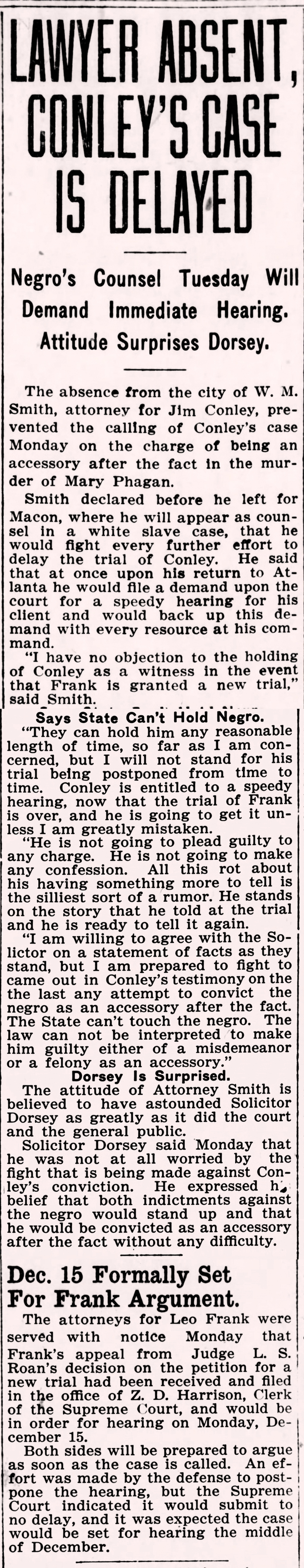 - 0521) Thursday, 20th November 1913: Conley's Attorney, To Combat Further Delay In His Case, The Atlanta Georgian [Last Updated On: December 31st, 2024] [Originally Added On: December 31st, 2024]