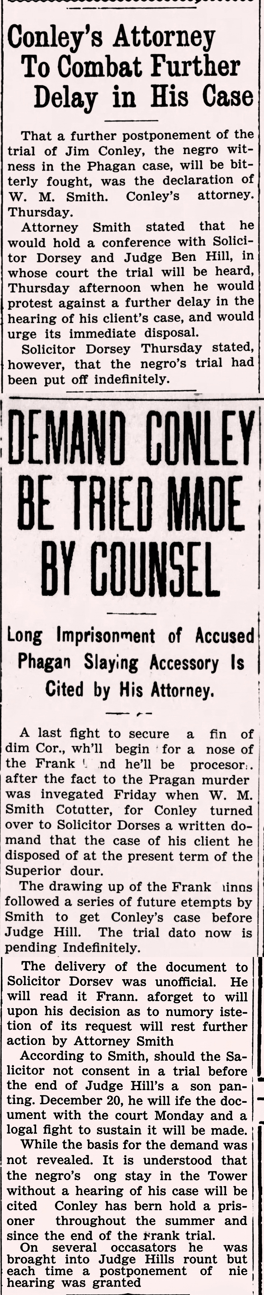 - 0522) Thursday, 20th November 1913: Conley's Attorney, To Combat Further Delay In His Case, The Atlanta Georgian [Last Updated On: December 31st, 2024] [Originally Added On: December 31st, 2024]