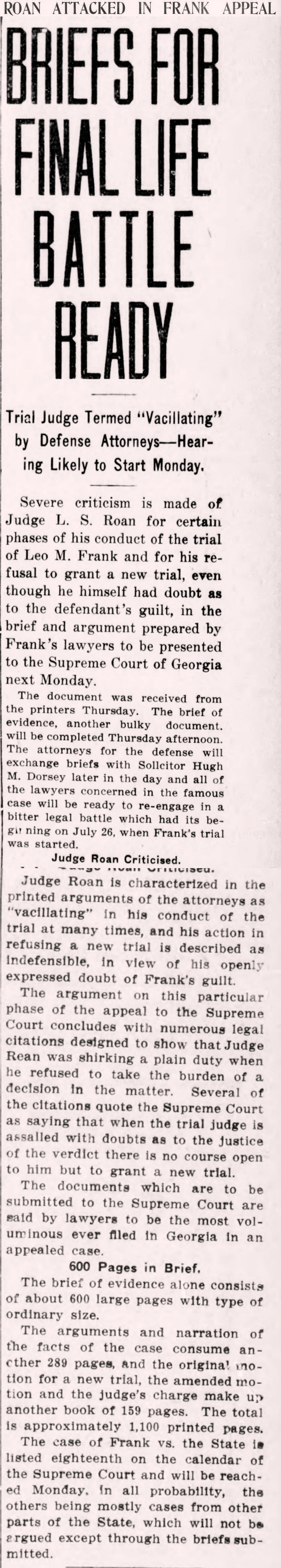 Severe criticism is made of Judge L. S. Roan for certain phases of his conduct of the trial of Leo M. Frank and for his refusal to grant a new trial, even though he himself had doubt as to the defendant's guilt, in the brief and argument prepared by Frank's lawyers to be presented to the Supreme Court of Georgia next Monday.