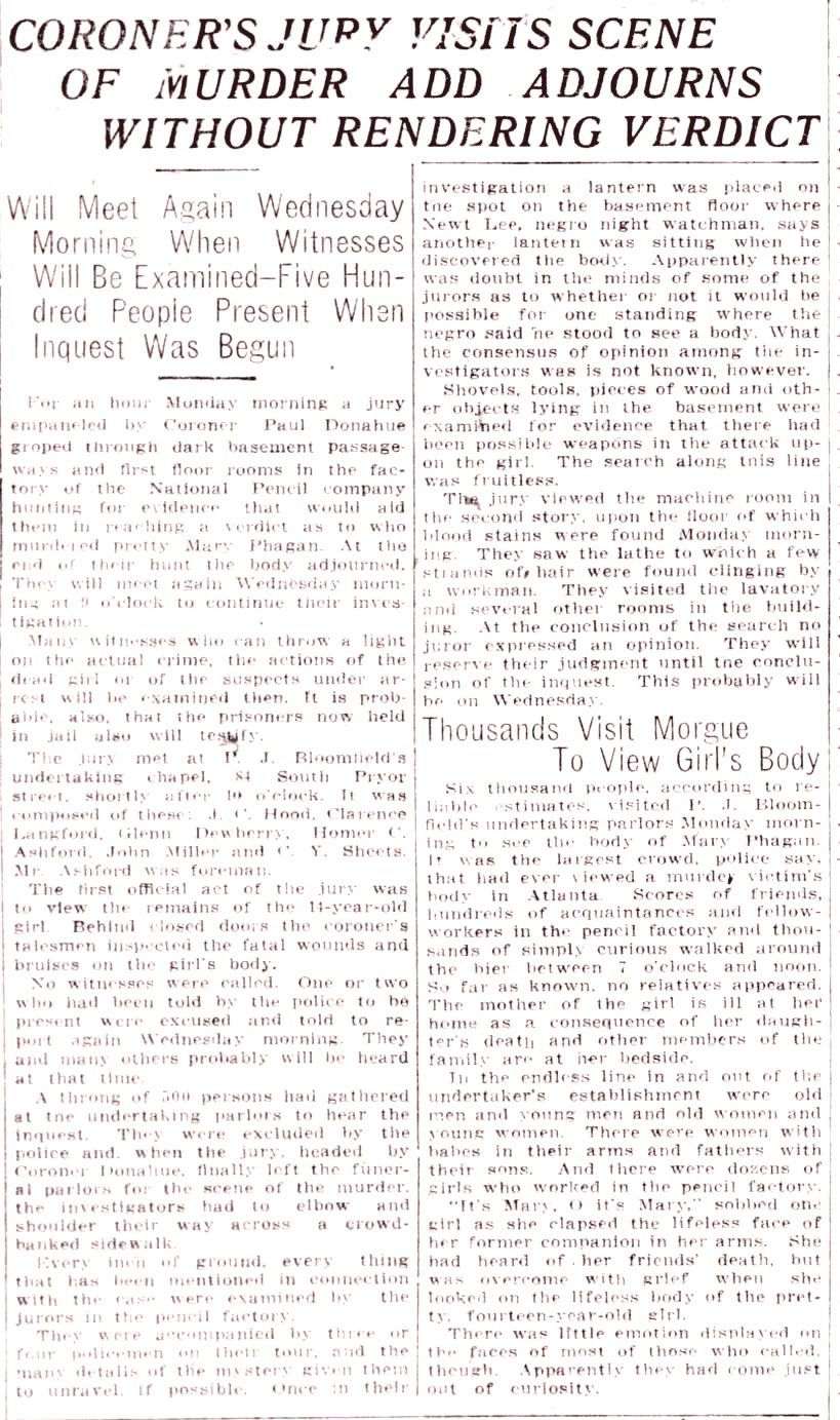 For an hour Monday morning a jury empaneled by Coroner Paul Donehoo groped through dark basement passageways and first floor rooms in the factory of the National Pencil company hunting for evidence that would aid them in reaching a verdict as to who murdered pretty Mary Phagan. At the end of their hunt the body adjourned. They will meet again Wednesday morning at 9 o'clock to continue their investigation.
