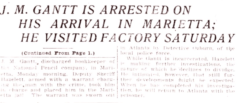 Following closely upon the arrest of J. M. Gantt, discharged bookkeeper of the National Pencil company, in Marietta, Monday morning, Deputy Sheriff Hazelett, armed with a warrant charging the man with the crime, took him in charge and placed him in the Marietta jail. The warrant was sworn out in Atlanta by Detective Ozburn, of the local police force.