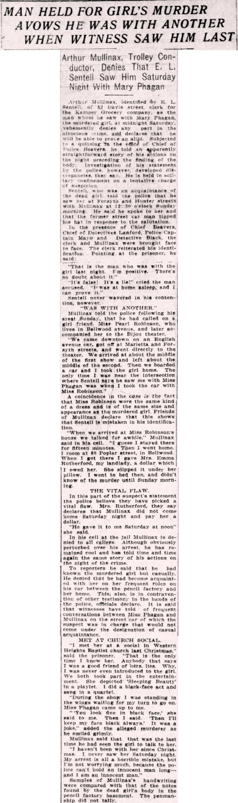 Arthur Mullinax, identified by E. L. Sentell, of 22 Davis street, clerk for the Kamper Grocery company, as the man whom he saw with Mary Phagan, the murdered girl, at midnight Saturday, vehemently denies any part in the atrocious crime, and declares that he will be able to prove an alibi. Subjected to a quizzing in the office of Chief of Police Beavers, he told an apparently straightforward story of his actions on the night preceding the finding of the body. Investigation of his statement by the police, however, developed discrepancies, they say. He is kept in solitary confinement on a tentative charge of suspicion.