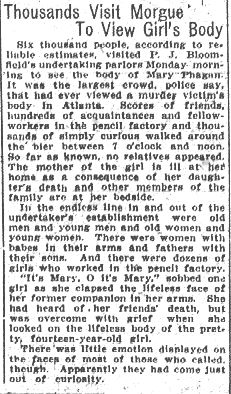 It was the largest crowd, police say, that had ever viewed a murder victim's body in Atlanta. Scores of friends, hundreds of acquaintances and fellow-workers in the pencil factory and thousands of simply curious walked around the bier between 7 o'clock and noon. So far as known, no relatives appeared. The mother of the girl is ill at her home as a consequence of her daughter's death and other members of the family are at her bedside.