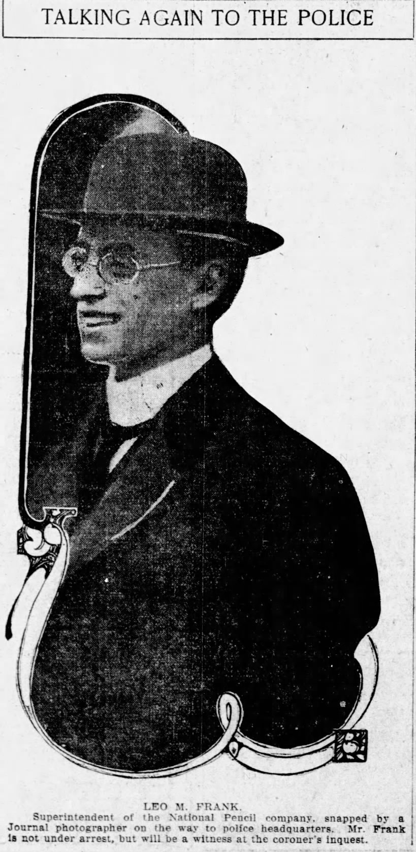 Leo M. Frank. Superintendent of the National Pencil company, snapped by a Journal photographer on the way to police headquarters. Mr. Frank is not under arrest, but will be a witness at the coroner's inquest.