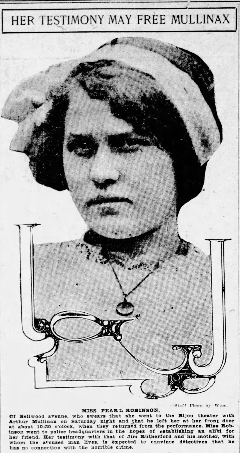 Miss Pearl Robinson, of Bellwood avenue, who swears that she went to the Bijon theater with Arthur Mullinax on Saturday night and that he left her at her front door at about 10:30 o'clock, when they returned from the performance. Miss Robinson went to police headquarters in the hopes of establishing an alibi for her friend. Her testimony with that of Jim Rutherford and his mother, with whom the accused man lives, is expected to convince detectives that he has no connection with the horrible crime.