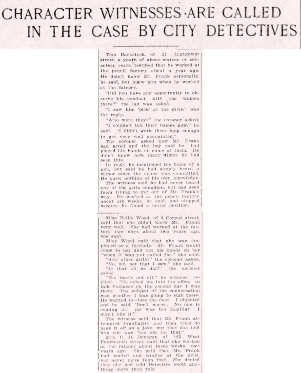 Miss Nellie Wood, of 8 Corput street, said that she didn't know Mr. Frank very well. She had worked at the factory two days about two years ago, she said.