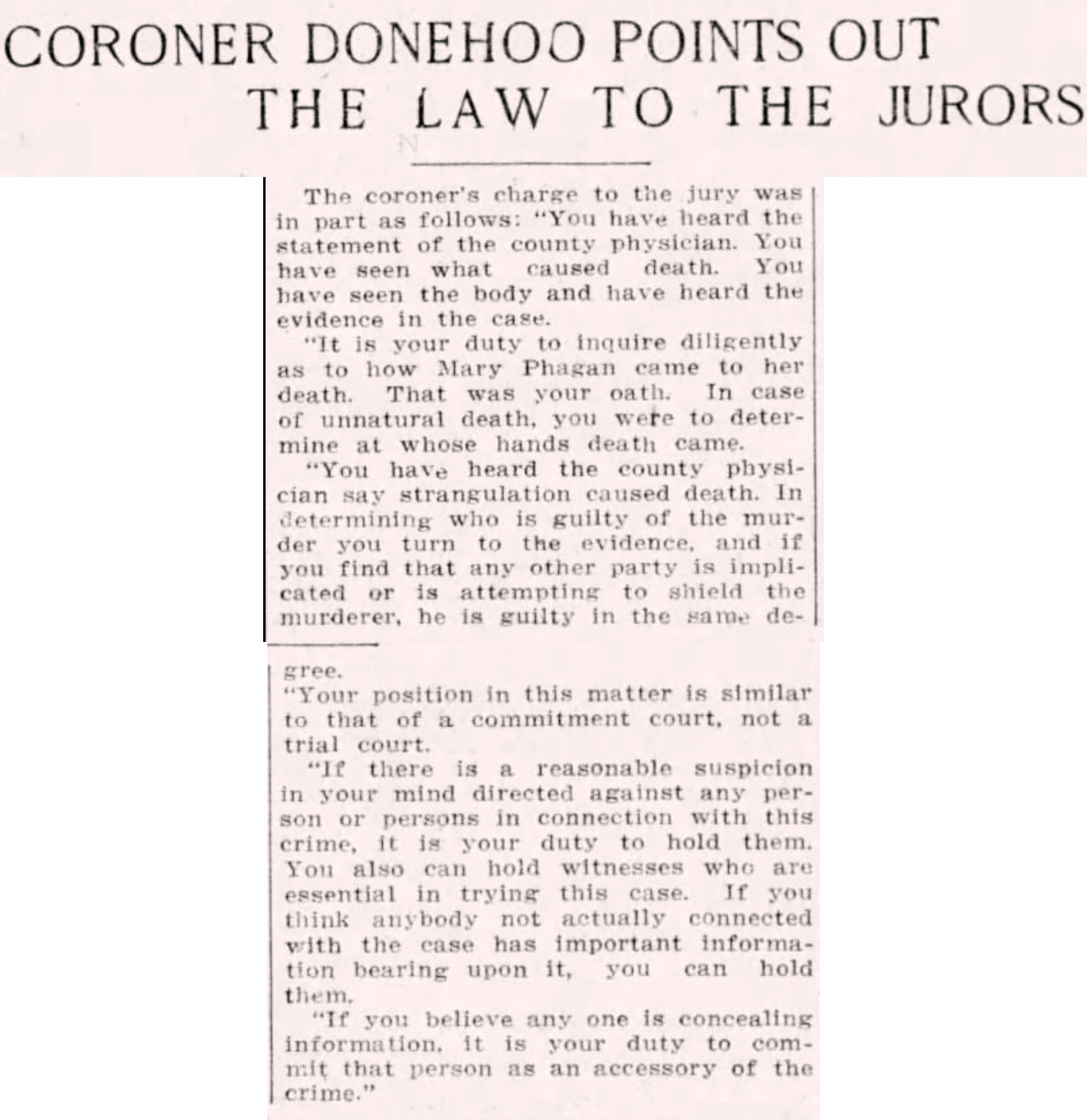"It is your duty to inquire diligently as to how Mary Phagan came to her death. That was your oath. In case of unnatural death, you were to determine at whose hands death came.