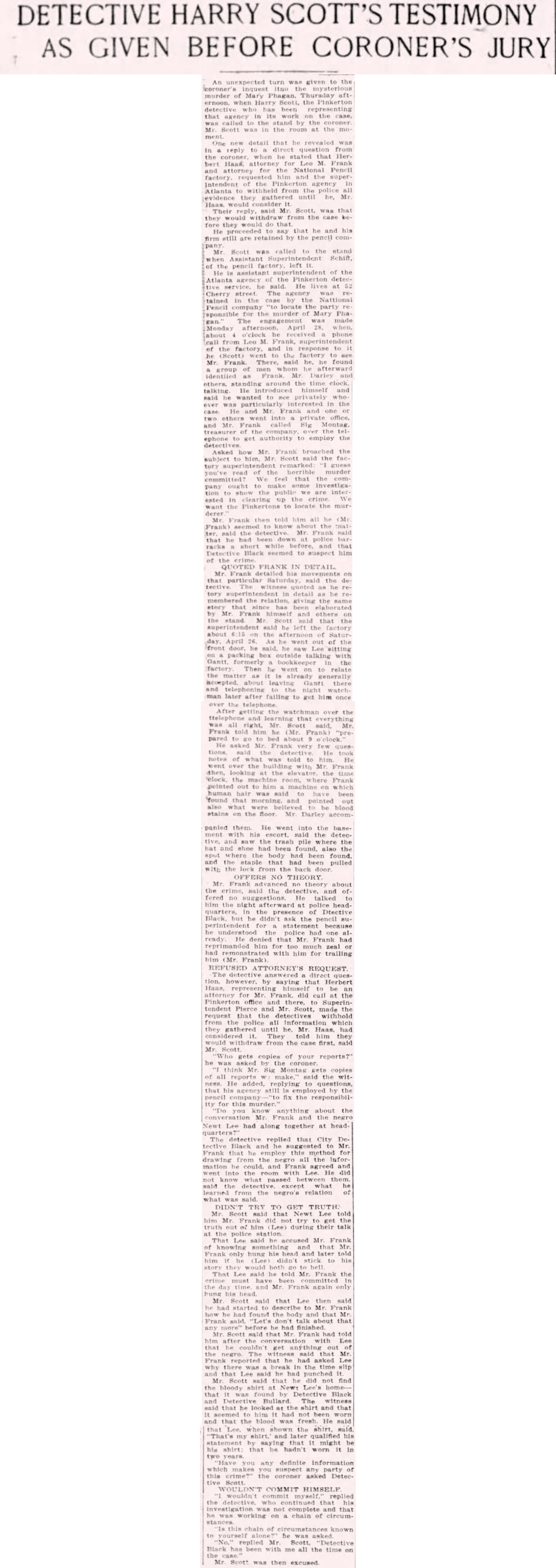 Asked how Mr. Frank broached the subject to him, Mr. Scott said the factory superintendent remarked: "I guess you've read of the horrible murder committed? We feel that the company ought to make some investigation to show the public we are interested in clearing up the crime. We want the Pinkertons to locate the murderer."
