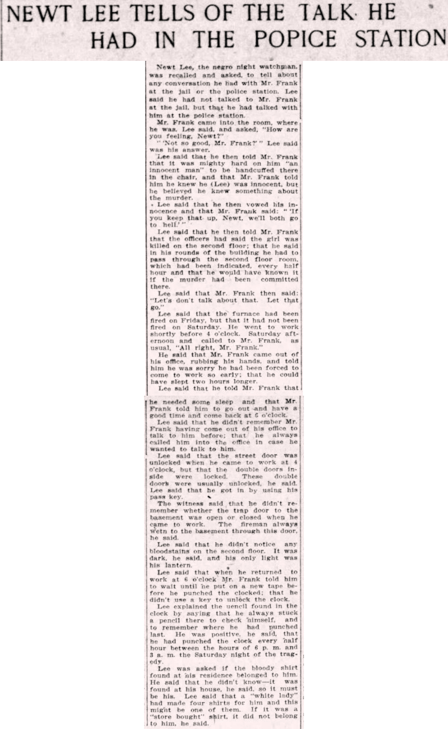 Newt Lee, the negro night watchman, was recalled and asked to tell about any conversation he had with Mr. Frank at the jail or the police station. Lee said he has not talked to Mr. Frank at the jail, but that he had talked with him at the police station.