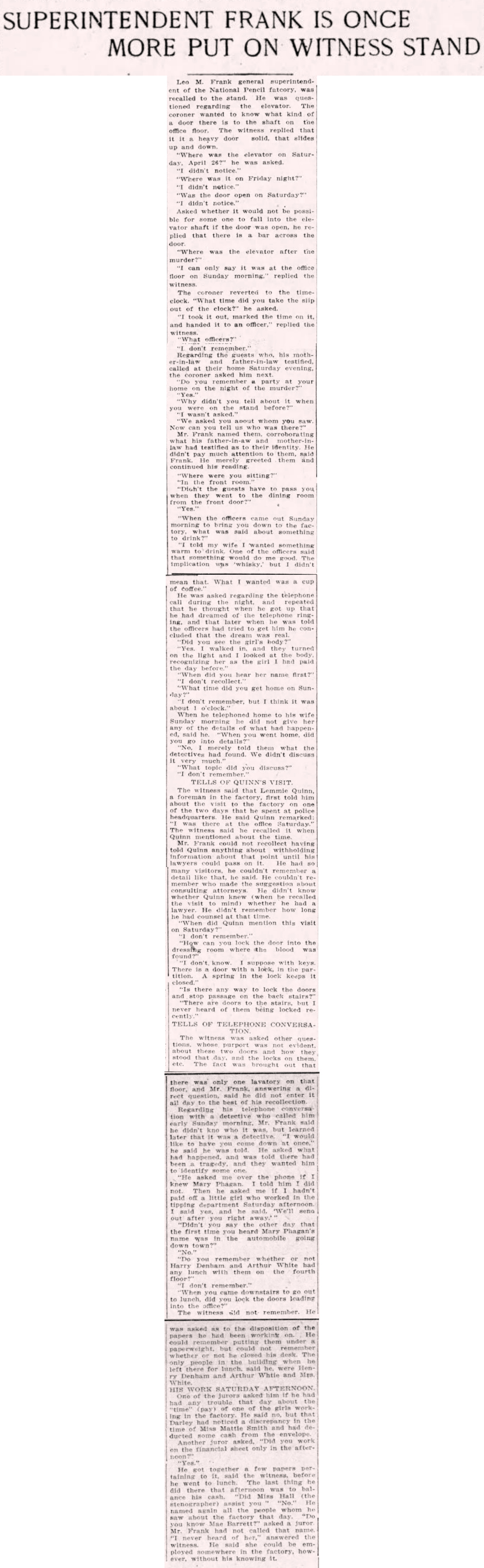 Leo M. Frank general superintendent of the National Pencil factory, was recalled to the stand. He was questioned regarding the elevator. The coroner wanted to know what kind of a door there is to the shaft on the office floor. The witness replied that it is a heavy door solid, that slides up and down.