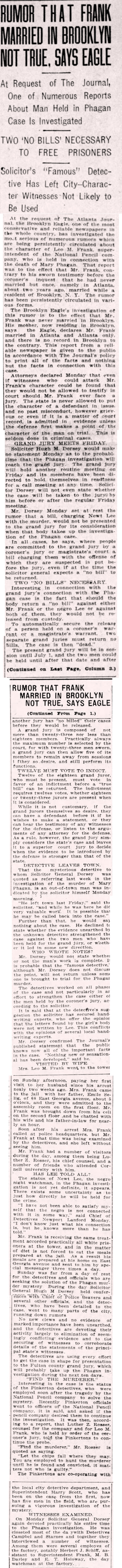 At the request of The Atlanta Journal, the Brooklyn Eagle, one of the most conservative and reliable newspapers in the whole country, has investigated the most serious of numerous rumors which are being persistently circulated about the character of Leo M. Frank, superintendent of the National Pencil company, who is held in connection with the death of Mary Phagan. That report was to the effect that Mr. Frank, contrary to his sworn testimony before the coroner's inquest that he had never married but once, namely in Atlanta, about two years ago, married while a resident of Brooklyn, N. Y. The rumor has been persistently circulated in various forms.