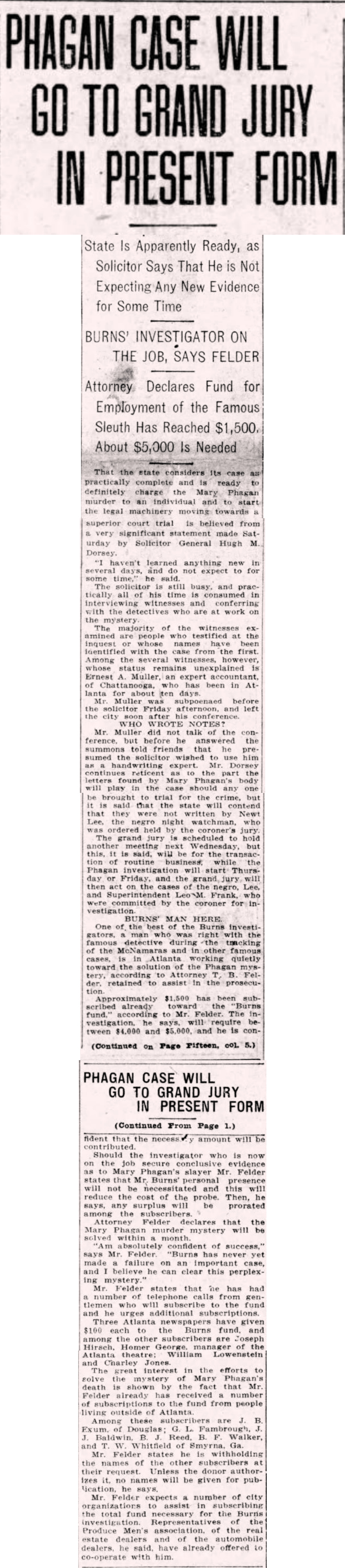 Should the investigator who is now on the job secure conclusive evidence as to Mary Phagan's slayer Mr. Felder states that Mr. Burns' personal presence will not be necessitated and this will reduce the cost of the probe. Then, he says, any surplus will be prorated among the subscribers.
