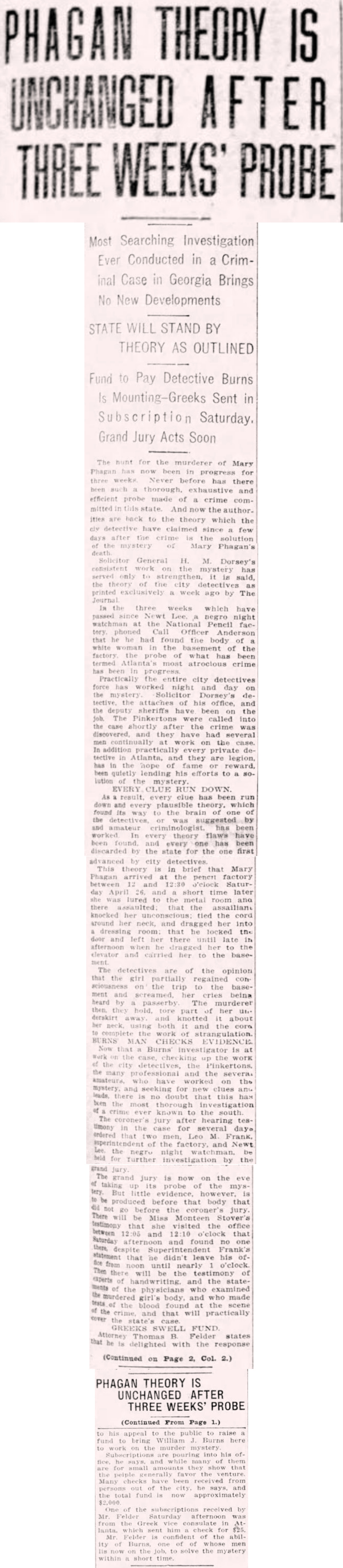 In the three weeks which have passed since Newt Lee, a negro night watchman at the National Pencil factory, phoned Call Officer Anderson that he he had found the body of a white woman in the basement of the factory, the probe of what has been termed Atlanta's most atrocious crime has been in progress.