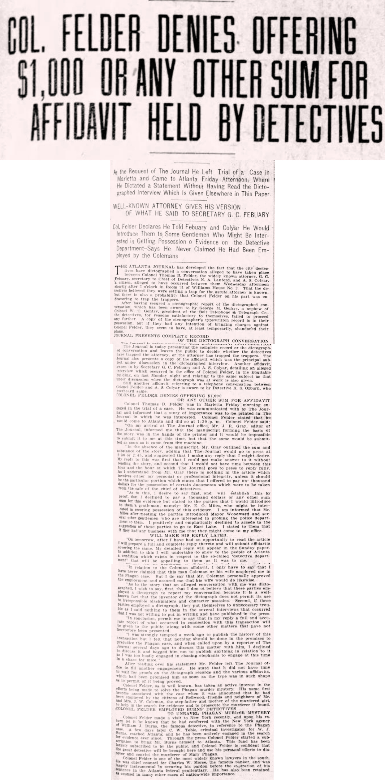Colonel Felder, as is well-known, has taken an active interest in the efforts being made to solve the Phagan murder mystery. His name first become [sic] associated with the case when it was announced that he had been employed by the citizens of Bellwood, friends and neighbors of Mr. and Mrs. J. W. Coleman, the step-father and mother of the murdered girl, to help in the search for evidence and to prosecute the murderer if found.