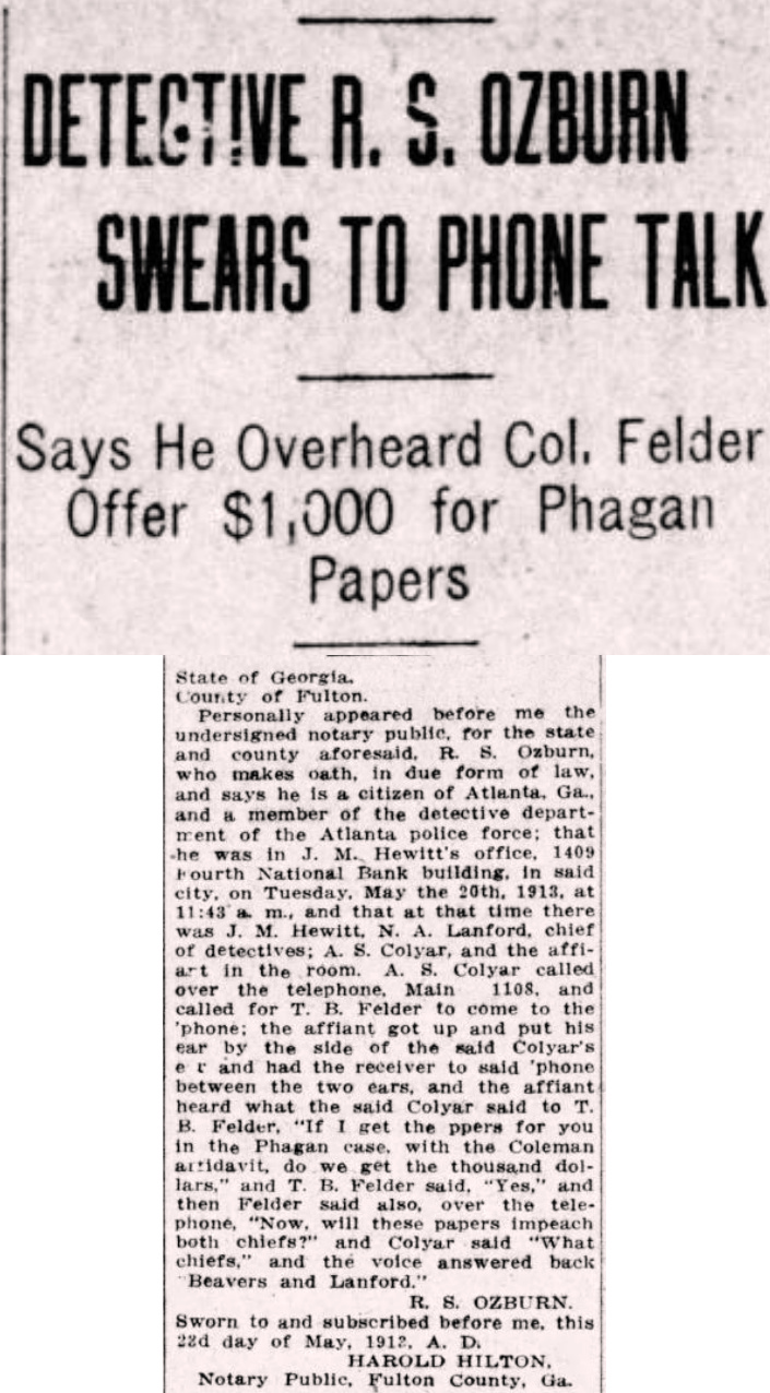 Personally appeared before me the undersigned notary public, for the state and county aforesaid, R. S. Ozburn, who makes oath, in due form of law, and says he is a citizen of Atlanta, GA., and a member of the detective department of the Atlanta police force; that he was in J. M. Hewitt's office, 1409 Fourth National Bank building, in said city, on Tuesday, May the 20th, 1913, at 11:43 a. m., and that at that time there was J. M. Hewitt, N. A. Lanford, chief of detectives; A. S. Colyar, and the affiant in the room. A. S. Colyar called over the telephone, Main 1103, and called for T. B. Felder to come to the phone; the affiant got up and put his ear by the side of the said Colyar's ear and had the receiver to said phone between the two ears, and the affiant heard what the said Colyar said to T. B. Felder. "If I get the p[a]pers for you in the Phagan case, with the Coleman affidavit, do we get the thousand dollars," and T. B. Felder said, "Yes," and then Felder said also, over the telephone, "Now, will these papers impeach both chiefs?" and Colyar said "What chiefs," and the voice answered back "Beavers and Lanford."