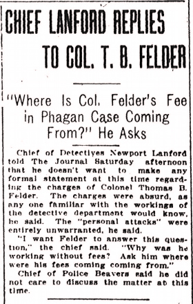 Chief of Detectives Newport Lanford told The Journal Saturday afternoon that he doesn't want to make any formal statement at this time regarding the charges of Colonel Thomas B. Felder. The charges were absurd, as any one familiar with the workings of the detective department would know, he said. The "personal attacks" were entirely unwarranted, he said.