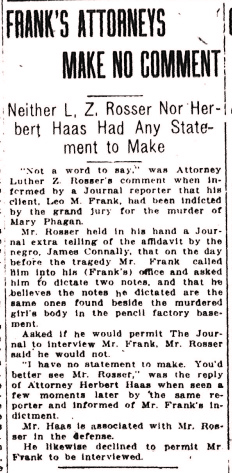 "I have no statement to make. You'd better see Mr. Rosser," was the reply of Attorney Herbert Haas when seen a few moments later by the same reporter and informed of Mr. Frank's indictment.