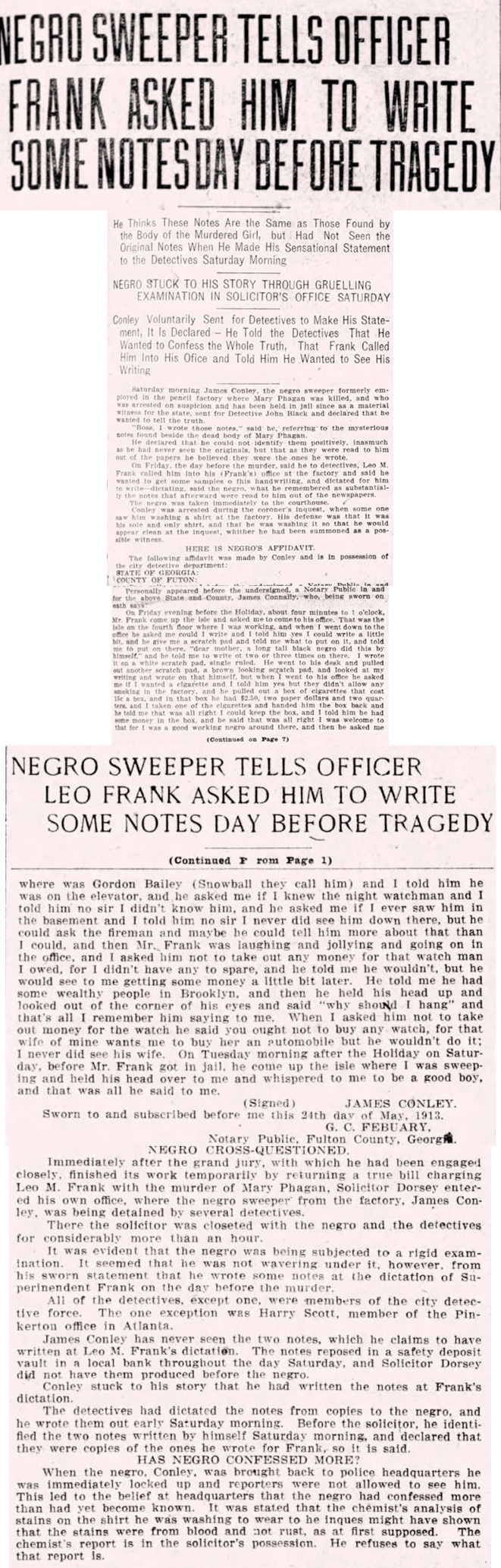 James Conley has never seen the two notes, which he claims to have written at Leo M. Frank's dictation. The notes reposed in a safety deposit vault in a local bank throughout the day Saturday, and Solicitor Dorsey did not have them produced before the negro.
