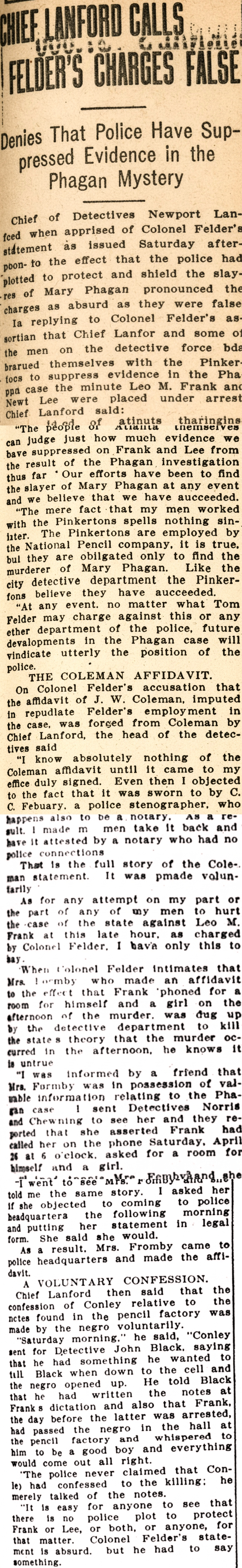 In replying to Colonel Felder's assertion that Chief Lanofor[d] and some of the men on the detective force hda [sic] leagued themselves with the Pinkertons to suppress evidence in the Phagan case the minute Leo M. Frank and Newt Lee were placed under arrest, Chief Lanford said: