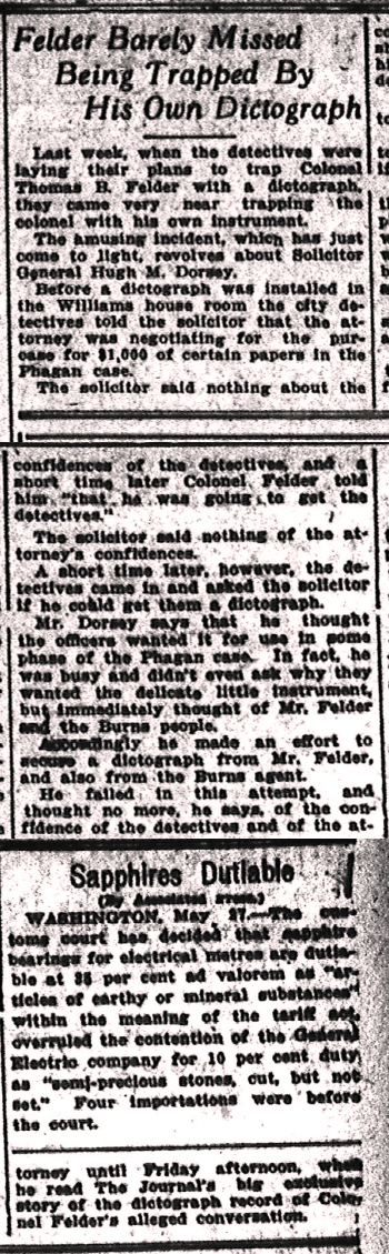 He failed in this attempt, and thought no more, he says, of the confidence of the detectives and of the attorney until Friday afternoon, when he read The Journal's big exclusive story of the dictograph record of Colonel Felder's alleged conversation.