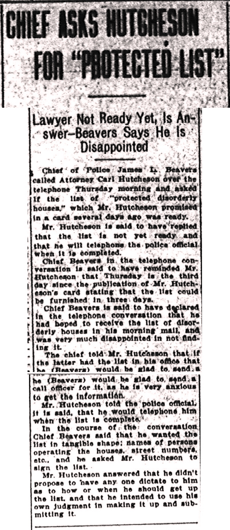 Chief of Police James L. Beavers called Attorney Carl Hutcheson over the telephone Thursday morning and asked if the list of "protected disorderly houses," which Mr. Hutcheson promised in a card several days ago was ready.
