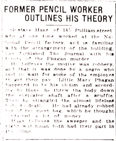 Gustave Haas, of 165 Pulliam street, who at one time worked at the National Pencil factory, and is familiar with the arrangement of the building, has furnished The Journal with his theory of the Phagan murder.