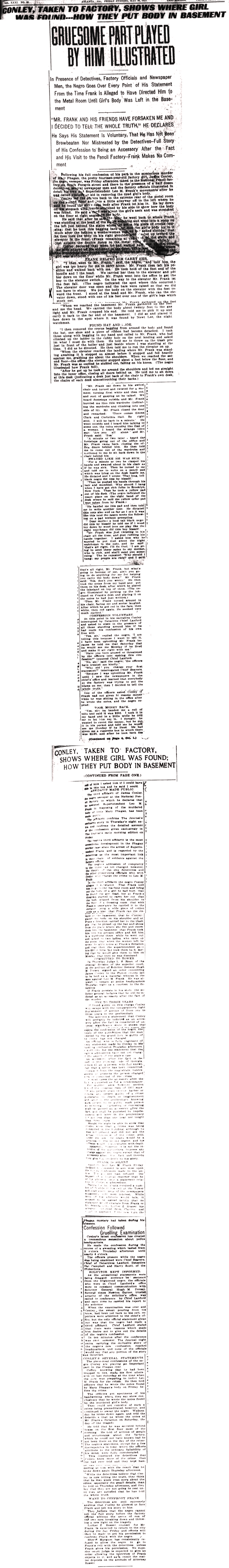 Following his full confession of his part in the mysterious murder of Mary Phagan, the pretty fourteen-year-old factory girl, James Conley, the negro sweeper, was Friday afternoon taken to the National Pencil factory on South Forsyth street and there in the presence of a half dozen detectives, several newspaper men and the factory officials illustrated in detail his own and Superintendent Leo M. Frank's movements after he was called upstairs to aid in removing the dead girl's body.