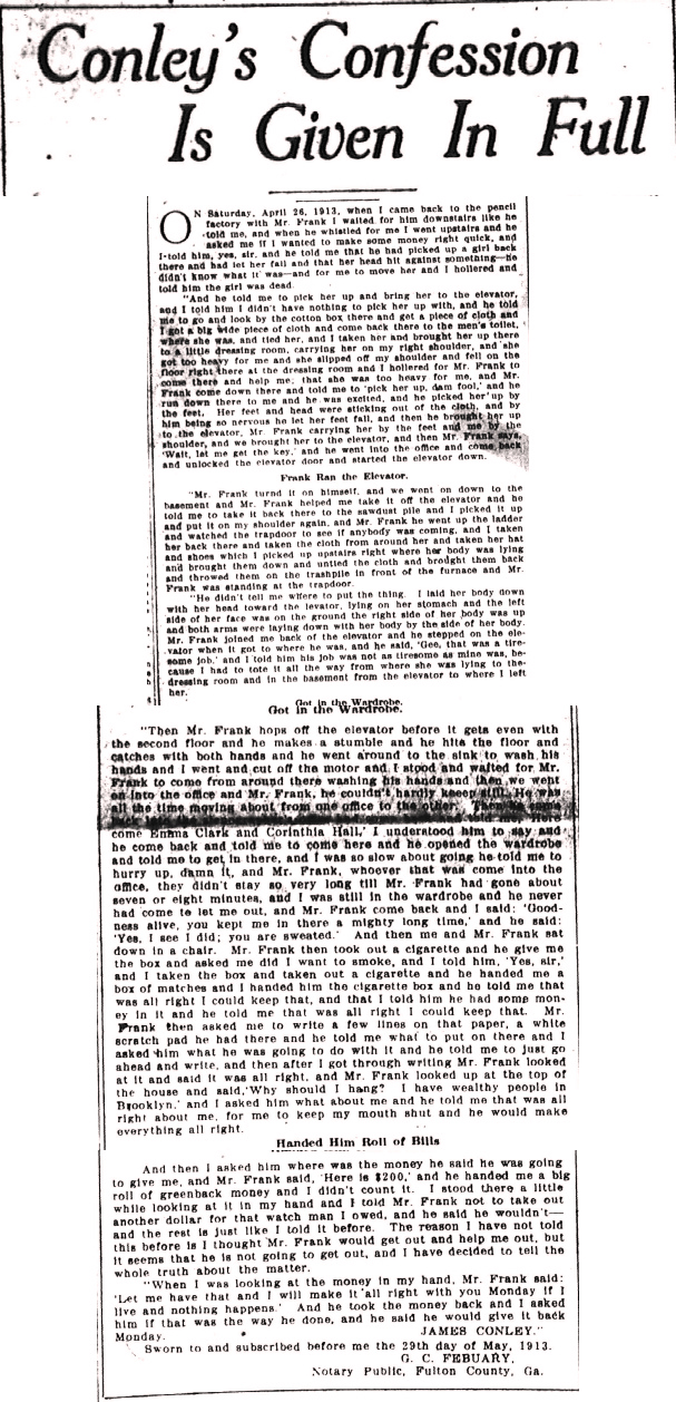 "And then I asked him where was the money he said he was going to give me, and Mr. Frank said, ‘Here is $200,' and he handed me a big roll of greenback money and I didn't count it. I stood there a little while looking at it in my hand and I told Mr. Frank not to take out another dollar for that watch man I owed, and he said he wouldn't—and the rest is just like I told it before. The reason I have not told this before is I thought Mr. Frank would get out and help me out, but it seems that he is not going to get out, and I have decided to tell the whole truth about the matter.