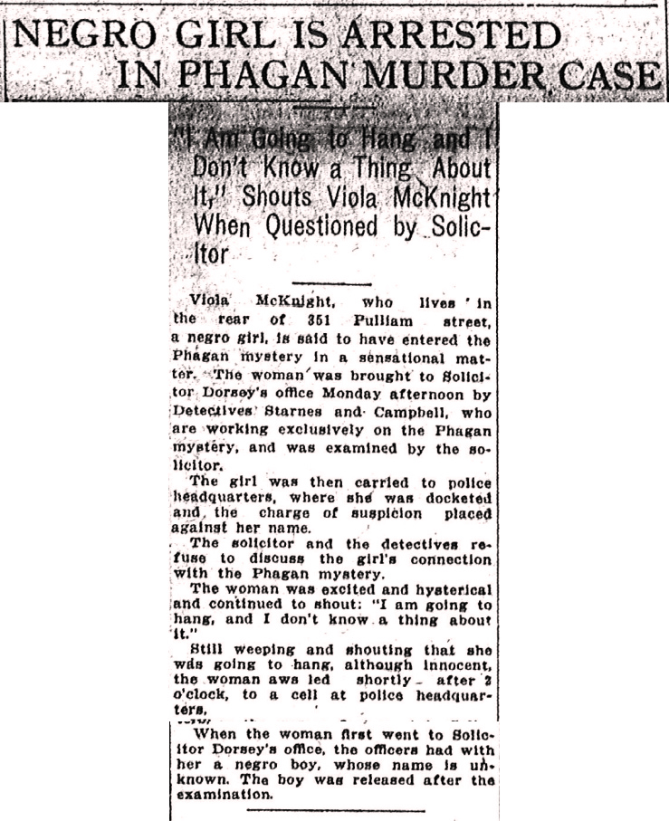 Viola McKnight, who lives in the rear of 351 Pulliam street, a negro girl, is said to have entered the Phagan mystery in a sensational matter. The woman was brought to Solicitor Dorsey's office Monday afternoon by Detectives Starnes and Campbell, who are working exclusively on the Phagan mystery, and was examined by the solicitor.