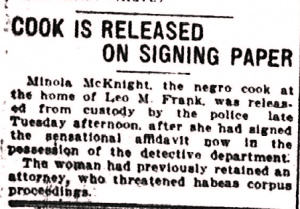 Minola McKnight, the negro cook at the home of Leo M. Frank, was released from custody by the police late Tuesday afternoon, after she had signed the sensational affidavit now in the possession of the detective department.