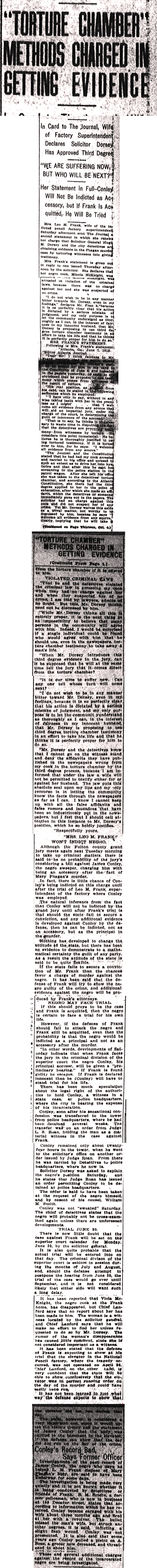 "In other words, developments of Saturday indicate that when Frank faces the jury in the criminal division of the superior court the negro Conley, his principal accuser, will be given a "preliminary hearing." If Frank is found guilty he escapes. If Frank is declared innocent then he (Conley) will have to stand trial for his life.