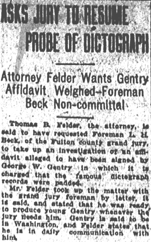 Thomas B. Felder, the attorney, is said to have requested Foreman L. H. Beck, of the Fulton county grand jury, to take up an investigation of an affidavit alleged to have been signed by George W. [sic] Gentry in which it is charged that the famous dictograph records were padded.
